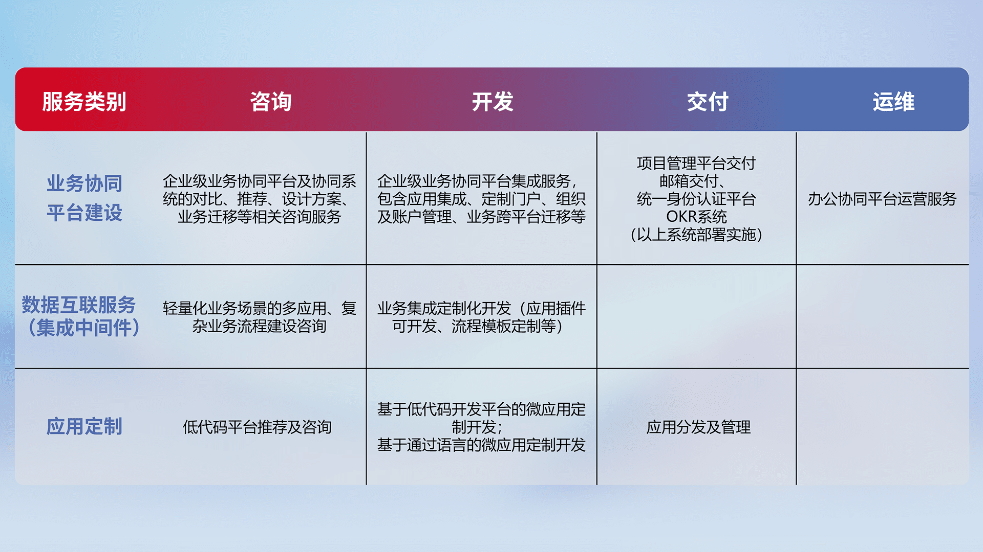针对钉钉、、企微、、IDaas等平台级产品提供产品的规划、、、方案、、交付、、、、定制化开发等服务,,,实现如统一协同办公、、、、智能客户服务、、、、混合会议管理、、、智能数据查询、、、、等业务场景,,实现数字化转型。。。。